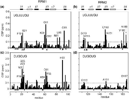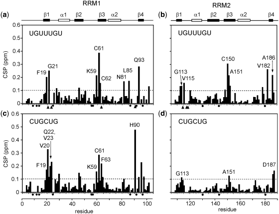 Figure 5. NMR CSP plots for the binding of EDEN 7 (UGUUUGU) and CUGCUG to the two isolated RRMs. In (a) and (b), EDEN7 binding to RRM1 is illustrated, and in (c) and (d), binding of CUGCUG to RRM1 and RRM2. In each case an arbitrary cut-off of 0.1 ppm is shown by the dotted line with residues showing CSPs > 0.1 ppm individually labelled. In addition, proline residues are marked with a black dot and residues which broaden and disappear during the titration are marked with an arrow head. Along the top of the figure the relative position of the protein secondary structure is indicated.