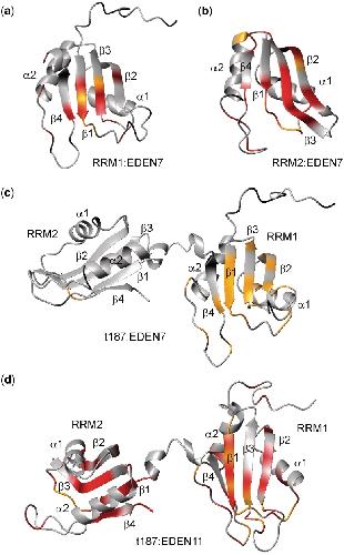 Figure 6. Structural representation of the CSPs mapped to the surface of the RRM1 (a), RRM2 (b) and T187 (c, d) for the RNA indicated. The magnitude of the CSPs is shown on a red to grey scale (largest perturbations shown in brightest red). Residues which broaden and disappear are marked in yellow, as particularly evident for the RRM1 domain of T187 on binding EDEN7.