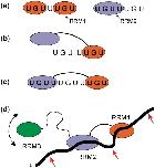 Figure 8. Schematic representation of the binding of RRM1, RRM2 and T187 to RNA substrates. (a) EDEN7 is able to accommodate two RRM1s on adjacent UGU sites, but only a single RRM2 can bind to the same sequence, suggesting specificity for a UGUU binding site. (b) EDEN7 is too short to bind the two RRMs of T187 in tandem, instead we observe an interaction through RRM1 which could be at either of the two UGU sites (one shown). (c) Binding of T187 to both sites of the consensus GRE sequence (EDEN11) with RRM2 bound at the 5′-terminal UGUU site. The spacer sequence of 5 nt between the tandem UGU sites results in high affinity binding. (d) Possible interaction of full-length CELF1 with a GU-rich substrate with RRM1 and RRM2 bound as for the consensus sequence in (c); the long linker between RRM2 and RRM3 permits considerable conformational flexibility in binding a third UGU site up or down stream (position of arrows), or even to the looped-out spacer sequence between the RRM1 and RRM2 binding sites.