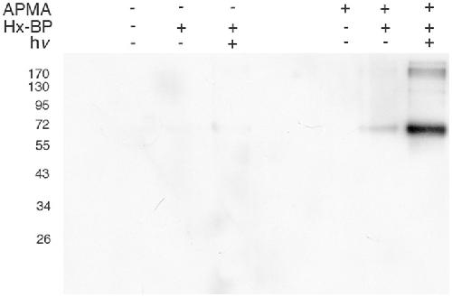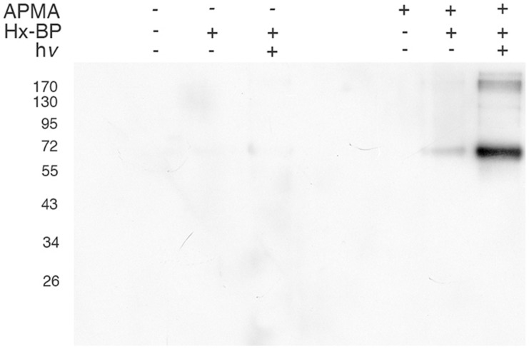 Figure 2. Hx-BP labels active MMPs in vitro.135 ng of human recombinant MMP-2 (hrMMP-2) was incubated with 0.5 nmol of biotinylated HxBP, with or without activation by APMA and with or without UV crosslinking, then resolved by SDS-PAGE and blotted to PVDF membrane. Streptavidin-HRP detection of biotinylated hrMMP-2 is dependent on both the activation status of the protease, and on exposure to UV light (hv).