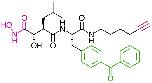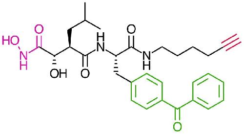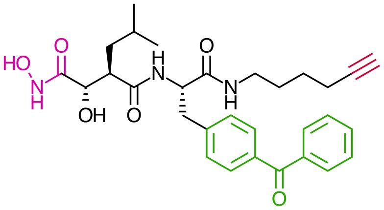 Figure 1. Structure of the Hx-PByne probe.The MMP labeling probes used were versions of this structure (compound 4 in [1]). The hydroxamic acid moiety (pink) chelates the catalytic zinc ion, and the benzophenone moiety (green) functions as a UV-photoactivateable crosslinking group. The terminal alkyne (red) allows the addition of groups such as biotin or rhodamine by click chemistry [1].
