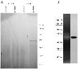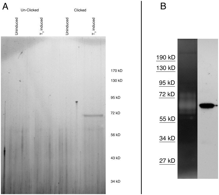 Figure 3. HxBP labels its target proteins in vivo.Live Xenopus tadpoles were injected with HxBP-alkyne, allowed to recover, exposed to UV light, and then sacrificed and protein extracts of the tails were subjected to click chemistry to biotinylate HxBP-tagged proteins. In panel A, biotinylated proteins were affinity purified by avidin chromatography, resolved by SDS-PAGE and detected by silver staining. A single protein with a mobility consistent with xMMP2 is detectable in the lane containing the HxBP-labeled proteome of the larvae that were induced to express xMMP2 by treatment with T3, and then biotinylated by click chemistry. In panel B, tail homogenates were split and run in parallel on a gelatin zymography gel (left) and for blotting to PVDF (right). Blots were probed with streptavidin-HRP, and revealed a single labeled protein at the same mobility as the gelatinolytic xMMP2 band on the zymograph.