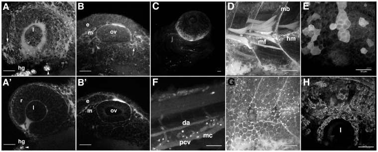 Figure 6. Details of HxBP labeling patterns reveal dynamics of active matrix remodeling.Z-projections of high magnification confocal micrographs illustrating patterns of HxBP labeling in both 24 hpf (A, B) and 72 hpf (C–H) zebrafish embryos. A) The developing zebrafish eye at 24 hpf, with HxBP labeling migratory mesenchyme (arrowhead), retinal epithelium (r), the choroid fissure and the hatching gland (hg). The lens shows no HxBP labeling, suggesting that matrix remodeling is absent in the lens. B) HxBP labeling the epithelial (e) and mesenchymal tissue (m) around the otic vesicle (ov), but no labeling within the otic vesicle. Primes are single focal planes of confocal stacks used to generate the non-prime panels. C) A ventrolateral view of the head of a 72 hpf embryo showing strong labeling in the developing scleral ossicles. Strong labeling is also evident in individual migratory mesenchyme cells and developing vasculature. D) lateral view of the anterior trunk showing strong labeling in the maturing myotome boundaries (mb), horizontal myoseptum (hm) and in individual myofibrils (mf) situated in the proliferative zone. E) Epithelia of the lateral head and dorsal aspect of the eye showing strong labeling in individual cells and patches of contiguous epithelial cells. F) lateral view of the tail showing strong labeling in migratory mesenchyme cells (mc), as well as labeling in the dorsal aorta (da), posterior cardinal vein (pcv) and intersomitic vessels (isv). G) lateral view of the surface epithelia covering the anterior trunk illustrating the ‘chicken wire’ patterning of HxBP labeling surrounding the periphery of the cells in this tissue. H) A dorsolateral view of the eye, illustrating strong HxBP labeling of mesenchymal cells invading across the surface of the retina and surrounding the lens (l). Scale bars are 50 µm in all panels.