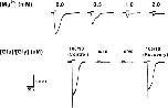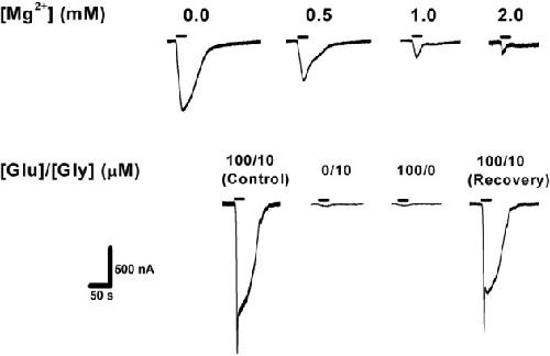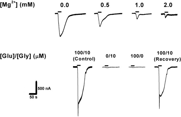 Figure 1. Confirmation of NMDAR expression in Xenopus laevis oocytes. Top: increasing extracellular [Mg2+] blocked NMDAR ionic current in a concentration-dependent manner (expected for all wild-type NMDARs). Bottom: activation of NMDAR requires simultaneous application of the co-agonists glutamate (100 μM) and glycine (10 μM), with no [Mg2+]o added. Agonist application time was 20 s (horizontal bars). GluN1-1b + GluN2B currents are shown as an example. The same measurements were performed with the other subunit combinations, confirming NMDAR currents in each case.