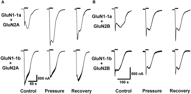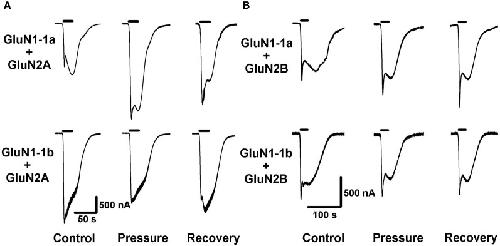 Figure 2. High pressure (HP) effects on GluN2A and GluN2B NMDAR subtypes. (A) HP selectively modulates currents of GluN2A subtypes. Top: HP augments GluN1-1a + GluN2A current. Bottom: HP decreases GluN1-1b + GluN2A current. (B) GluN2B subtypes GluN1-1a + GluN2B and GluN1-1b + GluN2B are not affected by HP. For all traces: The applied agonist concentrations were 100 μM (glutamate) and 10 μM (glycine) with no [Mg2+]o added. The 20 s agonist application time is indicated by horizontal bars. The HP effect is reversed after full decompression for all subtypes.