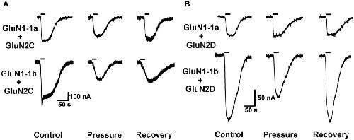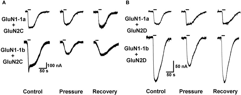 Figure 3. HP effects on GluN2C and GluN2D NMDAR subtypes. (A) HP differentially modulates GluN2C subtype currents. Top: HP moderately decreases GluN1-1a + GluN2C current. Bottom: HP greatly decreases GluN1-1b + GluN2C current. Note only partial recovery of the response. (B) HP selectively modulates GluN2D subtype currents. Top: GluN1-1a + GluN2D seem to be “pressure-resistant.” Bottom: HP decreases GluN1-1b + GluN2D current. Note complete recovery after a full decompression. For all traces: the applied agonist concentrations were 100 μM (glutamate) and 10 μM (glycine) with no [Mg2+]o added. The 20 s agonist application time is indicated by horizontal bars.