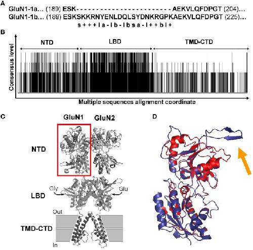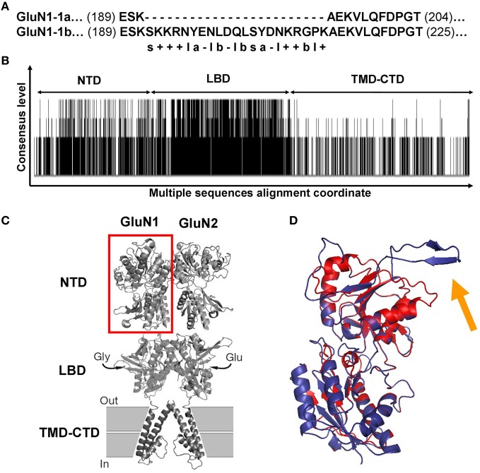 Figure 5. GluN1 and GluN2 sequence alignments and GluN1 NTD predicted structures. (A) Sequence alignment of GluN1-1a vs. GluN1-1b. The only difference between the two subunits is the extra 21 amino acids in the GluN1-1b NTD. s, Serine; “+,” positive charge residue; “–,” negative charge residue; l, hydrophilic; b, hydrophobic; a, aromatic. (B) Consensus and variation regions of the four GluN2 subunits. Summarized are the results of the multiple sequence alignments of GluN2A, B, C, and D using Clustal W (Larkin et al., 2007). Each black line represents a sequence homology of at least two of the four compared sequences. Line length represents the consensus level. As expected, the LBD is the most conserved. Blank areas represent the absence of sequence homology. (C) GluN1-GluN2 dimer model. Red square frame indicates GluN1 NTD. (D) Predicted GluN1 NTD tertiary structures. GluN1-1a (red) and GluN1-1b (blue) are superimposed. The orange arrow indicates the loop of the extra 21 amino acids of GluN1-1b. Note that this loop points away from the structure. The figure was created using PyMOL Molecular Graphics System, Version 1.2r3pre, Schrödinger, LLC. NTD, N-terminus domain; LBD, ligand binding domain; TMD-CTD, transmembrane domain and C-terminus domain.