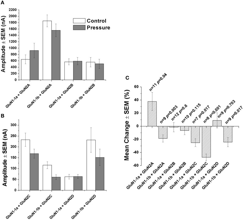 Figure 4. Statistical analysis of NMDAR currents. (A) Mean current amplitude under control and hyperbaric conditions (GluN1-1a or GluN1-1b with GluN2A or GluN2B). (B) Mean current amplitude under control and hyperbaric conditions (GluN1-1a or GluN1-1b with GluN2C or GluN2D). (C) Mean % change of amplitude (calculated for each pair of measurements and averaged). “Control,” 0.1–0.3 MPa; “Pressure,” 10.1 MPa; n, number of experiments (oocytes); p, degree of statistical significance; SEM, standard error of mean. Statistical tests: paired t-test (0.1–0.3 MPa vs. 10.1 MPa).