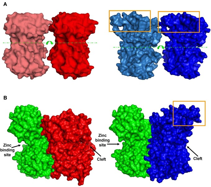Figure 6. Predicted dimer structures. (A) GluN1 homodimers. Left (red)—A 3D model of GluN1-1a↔GluN1-1a NTD interactions. Right (blue)—A 3D model of GluN1-1b↔GluN1-1b NTD interactions (manual docking). Box—the extra 21 amino–acid-loop (exon 5). This structure might interfere with the interaction of GluN1-1b subunits. Broken lines indicate the cleft. Arrows represent the cleft's direction. (B) GluN1-GluN2 heterodimer 3D structures. Left—docking of GluN1-1a NTD (red) to GluN2A NTD (green). Right—docking of GluN1-1b NTD (blue) to GluN2A NTD (green). Note that the loop of 21 extra amino acids in GluN1-1b (orange box) faces out and does not interfere with sub-domain interaction. The figure was created using PyMOL.
