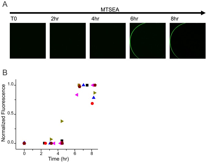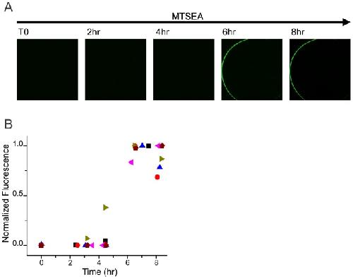 Figure 2. Time course of cell surface expression for R272C CNGA1-GFP channels exposed to MTSEA.A. Representative confocal images of one oocyte before (T0) and after 2 mM MTSEA exposure. Media with fresh MTSEA was exchanged every 30 min. After ∼6 hrs of MTSEA treatment, GFP fluorescence was detectable at the oocyte’s surface. B. Plot shows the time course of cell surface fluorescence detection in six different oocytes.