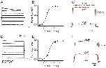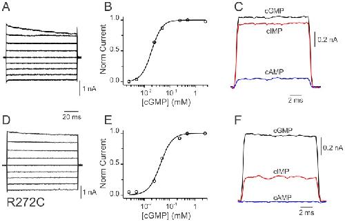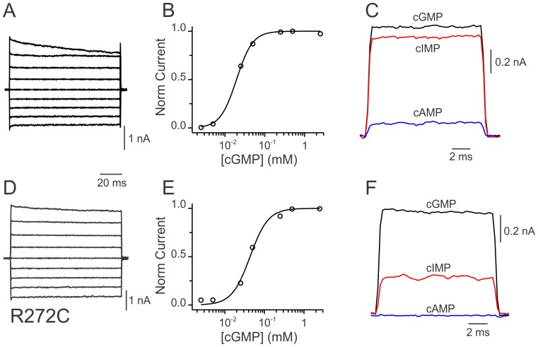 Figure 3. Functional characterization of CNGA1-GFP channels at the cell surface.A, B & C. Cysteine-less CNGA1-GFP channels. A, Ionic currents in the presence of saturating [cGMP] (2 mM). cGMP-activated currents shown were acquired in response to 100 ms voltage steps from −80 to +80 mV (every 20 mV) from a holding potential of 0 mV. B. Dose response for cGMP at +60 mV. Solid line represents a normalized Hill equation fit to the data. The best fit parameter values for K½ was 19±1 µM, and for the hill coefficient (n) was 2.1±0.2. Average values for K½ and n were 24±3 µM and 2.16±0.46, respectively (n = 4 oocytes). C. Efficacies for different agonists. Wild type CNGA1 channels displayed larger than 95% maximal probability of opening with saturated concentrations of cGMP, less with cIMP, and much less with cAMP. Nucleotide-activated current records shown were obtained from the same excised inside out patch with saturating concentrations of cGMP (2 mM; black), cIMP (16 mM; red) and cAMP (16 mM; blue). D, E & F. Rescued R272C CNGA1-GFP channels. D. Ionic current carried by MTSEA-modified R272C channels. In response to a comparable experimental protocol as in A, rescued channels were able to conduct ionic current with similar properties as wild type channels. E. Dose response of modified R272C channels at the cell surface for cGMP. Solid line corresponds to a normalized Hill equation fit to the data. The best fit parameter values for K½ and n were 43.4±2.5 µM and 1.9±0.3, respectively. Average values for K½ and n were 59±10 µM and 1.48±0.22, respectively (n = 14 oocytes). F. Agonist efficacies for rescued R272C mutant channels. Nucleotide-activated current records shown were acquired from the same patch, using the equivalent agonist concentration as in C. Similar observations were made in 3 different patches.