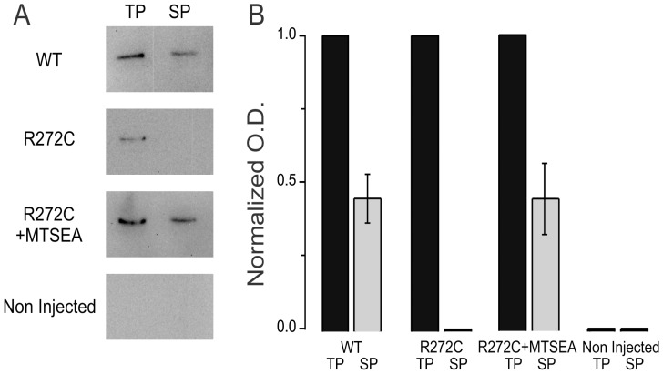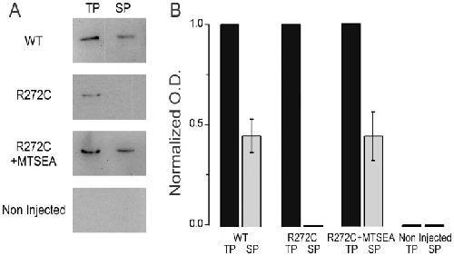 Figure 4. Cell surface expression of CNGA1-GFP channels.A. Representative Western blot of total CNGA1-GFP protein (TP) and biotinylated CNGA1-GFP cell surface protein (SP). WT, R272C, R272C+MTSEA denote cysteine-less CNGA1-GFP, mutant channels that were not treated with MTSEA and mutant channels that were modified by MTSEA, respectively. An expected band of ∼106 kDa for the deglycosylated wild-type GFP tagged channel was detected by chemiluminiscence using a GFP antibody. No signal was detected in non injected oocytes. B. Densitometry analysis of the bands normalized to TP (n = 3 different oocytes batches).