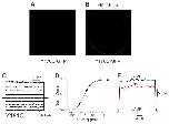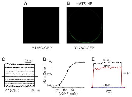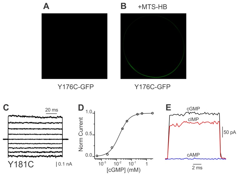 Figure 5. Y176C CNGA1-GFP mutant channels.A. Confocal image of an oocyte injected with cRNA encoding for Y176C CNGA1-GFP channels. We never detected any signs of proper trafficking in >100 oocytes by standard fluorescence microscopy, suggesting that these channels do not reach the cell surface. B. MTSHB treatment recovers proper trafficking of Y176C mutant channels to the cell surface. Confocal image shows GFP fluorescent signal at the cell surface of an oocyte expressing Y176C mutant channels. MTSHB was injected ∼ 12 h before acquiring the image (n >25 oocytes). C. Ionic currents in the presence of a saturating cGMP concentration (2 mM), in response to the same voltage protocol as described in Fig. 3A. D. Dose response for cGMP at +60 mV. Solid line represents a normalized Hill equation fit to the data. The best fit parameter values for K½ and n were 16±1 µM and 1.30±0.05, respectively. From a total of 8 oocytes, the average values for K½ and n were 16±3 µM and 1.6±0.1, respectively. E. Agonist efficacies of rescued Y176C mutant channels. Nucleotide-activated current records shown in the presence of saturating concentrations of each agonist (same as Fig. 3C) were acquired from the same excised patch. Rescued Y176C channels showed a similar efficacy pattern as cysteine-less CNGA1-GFP channels. Similar observations were observed in 4 patches.