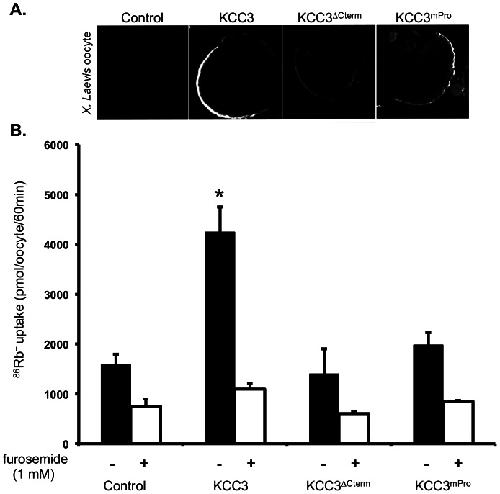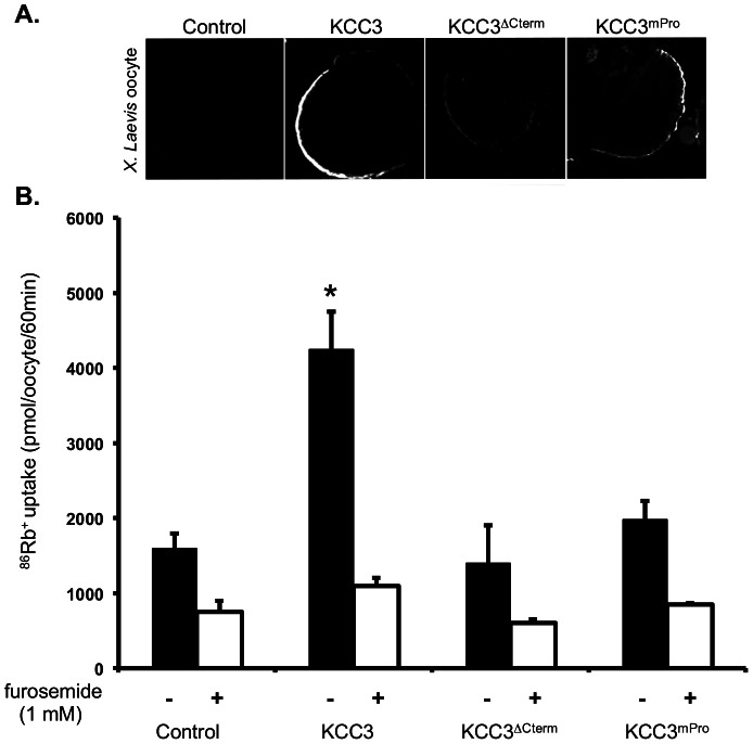 Figure 2. Evaluation of wild-type and mutant KCC3ΔCterm, KCC3mPro functions in Xenopus oocyte flux assays.(A) Wild-type KCC3 and mutant KCC3ΔCterm, KCC3mPro transit to the plasma membrane in Xenopus Laevis oocytes. Immunofluorescence staining of KCC3 using a specific antibody shows all generated forms at the plasma membrane of the injected oocytes. Control oocytes were injected with water instead of the wild-type and mutant KCC3 cRNAs. (B) Directed mutagenesis of the proline motif leads to impaired function of KCC3 in Xenopus Laevis oocyte flux assay. 86Rb+ flux of wild-type and mutant KCC3 is measured under hypotonic conditions in presence or absence of KCCs inhibitor, furosemide.