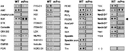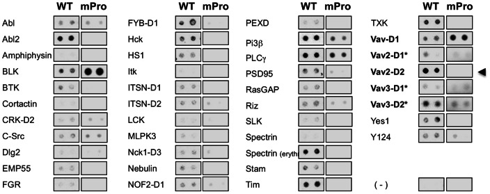 Figure 3. KCC3 proline-rich segment mediates binding to Vav2 SH3-domain.The proline-rich sequence interacts with a collection of SH3 domains detected after incubation of a biotinylated wild-type peptide (LLNMPGPPRNPEGDE) with a commercially available SH3 domain array (Panomics). Wild-type peptide binds to the second SH3 domain (D2) of the Vav proteins Vav2 and Vav3 but not to the SH3-domain of cortactin. To control for binding specificity of the wild-type peptide on the array, a peptide mutated for two proline residues (LLNMPGQARNPEGDE) was used in parallel experiments.