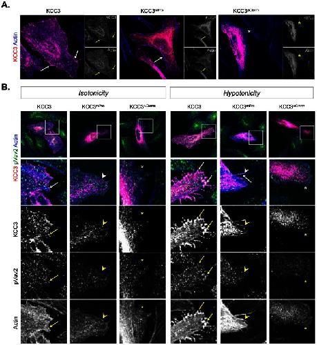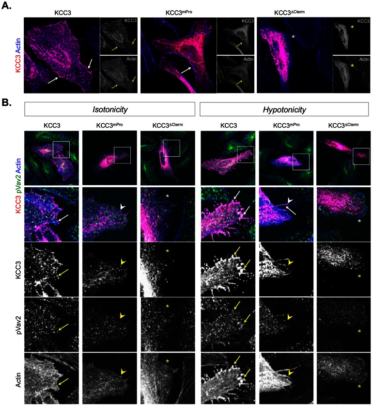 Figure 5. KCC3 colocalizes with the active form of Vav2 in actin-rich membrane protrusions induced by hypotonic conditions.(A) Distribution of wild-type and mutant KCC3 forms in transiently transfected HeLa cells. Note the aberrant distribution of the KCC3 mutant forms in the cytoplasm. (B) The active form of Vav2 accumulates with wild-type KCC3 but not with KCC3mPro or KCC3ΔCterm at the cell periphery. Wild-type KCC3 accumulates with pVav2 in actin-rich plasma membrane protrusion under hypotonic conditions (left panel). These results were obtained after a 10 min treatment either in an isotonic or in a hypotonic medium. In the merged images, KCC3 reactivity is indicated in red, pY-Vav2 is indicated in green and polymerized actin detected by phalloidin is indicated in blue. Arrows indicate co-localisation; the stars (*) indicate actin-rich membrane not showing KCC3 immuno-detection; the arrowheads indicate actin-rich membrane showing KCC3 immuno-reactivity but not pVav2 co-localisation.