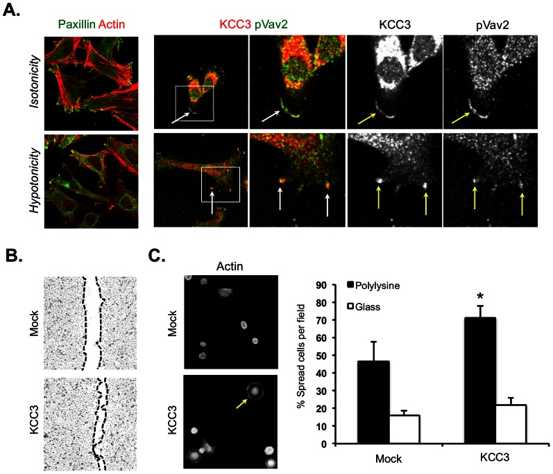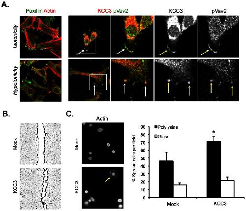 Figure 6. KCC3 is involved in processes dependent of actin structural dynamic.(A) Involvement of KCC3 in the formation of in cell protrusions. KCC3 co-localizes with the active phosphorylated form of Vav2 at lamellipodia-rich migrating front of HeLa cells that stably overexpress KCC3 (top panel). HeLa cells stably expressing the wild-type form of KCC3 were subjected to a hypotonic choc and show intense co-localization of KCC3 and pY-Vav2 to hypotonicity-induced membrane protrusions (Low panel). Involvement of KCC3 in these processes was assessed after a 5 min treatment in this experiment. On the merged image, KCC3 is indicated in red and Vav2 is stained in green. Co-localization is observed by the overlapping of the two stainings seen as a yellow signal. (B) KCC3 role in cell migration. Stable overexpression of KCC3 in cervical cancer (HeLa) cells accelerates wound closure in scratch assays experiments. (C) Spreading assay determines novel role of KCC3 in cell spreading. HeLa cells were visualized for their polymerized actin with rodamin-phalloidin. Quantification of the spreading cells on poly-lysine coated and uncoated slides (n = 3).