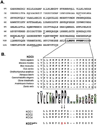 Figure 1. Identification of a functional proline-rich motif in the C-terminal domain of KCC3.(A) Protein sequence of the KCC3 C-terminal domain. The C-terminus of KCC3 contains a distal poly-proline motif indicated in bold characters which is predicted to be a binding site for SH3 domains with a non-canonical class I recognition specificity (ELM motif data base). The C-terminus also contains a hydrophobic tetrad and a predicted Tyrosine residue (both underlined) involved in cation-chloride co-transporter trafficking. Predicted PDZ domains interacting motifs are shown in italic. Three HMSN/ACC non-sense mutations are indicated by a dot (.). The phosphorylated sites are indicated by a star (*). (B) KCC3 C-terminal domain is highly conserved in the proline-rich region. The motif is conserved at 100% between KCC3 homologs but also between KCC3 orthologs KCC1, KCC2 and KCC4. The proline stretch was mutated in order to generate mPro mutant forms of KCC3 polypeptide and protein.