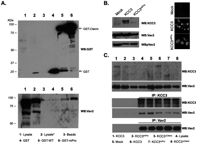 Figure 4. Vav2 interacts with the C-terminal domain of KCC3.(A) Vav2 endogenously expressed by HeLa cells binds to the C-terminal domain of KCC3 in GST-pull down assays. Lysate = whole protein lysate extracted from HeLa cells; Lysate* = pre-cleared HeLa cell protein lysate incubated with sepharose beads; GST = pre-cleared protein lysate incubated with GST only; GST-WT = pre-cleared protein lysate incubated with chimeric protein where KCC3 C-teminus was fused to GST; GST-mPro = pre-cleared protein lysate incubated with chimeric protein where KCC3 C-terminus was mutated for two prolines (PP→QA) and fused to GST. (B) KCC3 and Vav2 are endogenously expressed in HeLa cells. Transient over-expression of KCC3 in HeLa cells is associated with abundant accumulation of the wild-type protein (but not the proline mutated form) in cellular protrusions. (C) Vav2 and KCC3 co-immunoprecipitate together in HeLa cells. Lysate = whole protein lysate extracted from HeLa cells; Mock = protein lysate extracted from HeLa cells transfected with the control empty vector; KCC3, KCC3mPro and KCC3ΔCterm = protein lysate from HeLa cells transfected with the indicated KCC3 form.