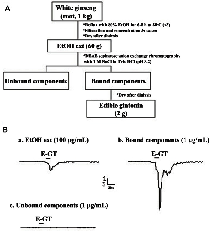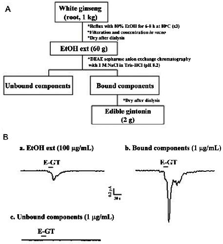 Fig. 1. Diagram for an edible gintonin (E-GT) preparation from Panax ginseng root. (A) A complete diagram for crude gintonin preparation from ginseng root. (B) The representative Ca2+-activated Cl- channel (CaCC) current traces are representative of one obtained from each preparation step. Treatment with ethanol extraction (EtOH ext) and the bound component obtained after elution with NaCl in Tris-HCl (pH 8.2) induced endogenous CaCC activation in Xenopus oocytes, whereas unbound component had no effect. The amount of each fraction used to test CaCC activity was 1 or 100 μg/mL. Inward currents were recorded at –80 mV holding potential.