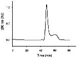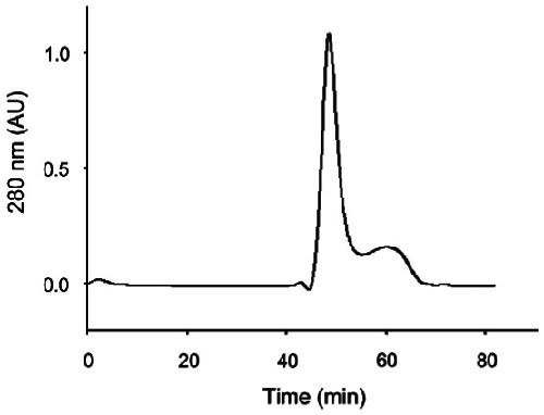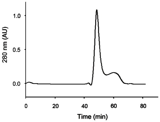 Fig. 3. Elution patterns of gintonin prepared from ginseng root by gel chromatography. Gel filtration chromatograms on Superdex 75 column with phosphate buffered saline (pH 7.2) of edible gintonin prepared from ginseng root. Analysis through gel filtration chromatograms showed one main peak and other minor peaks. The main peak was active for the activation of Ca2+-activated Cl- channel.