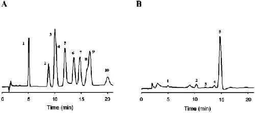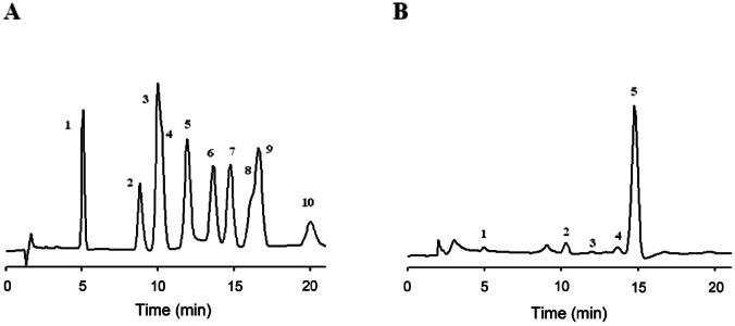 Fig. 4. Analysis of carbohydrate components of crude gintonin prepared from ginseng root by high performance anion exchange chromatography-pulsed ampherometric detection (HPAEC-PAD) chromatograms. HPAEC-PAD chromatograms revealed that gintonin to be mainly composed of three different kinds of neutral sugars: glucose, arabinose, galactose, and fucose and one amino sugar, glucosamine. (A) Std stands for standard carbohydrates used; 1. L-fucose, 2. L-rhamnose, 3. D-galactosamine, 4. D-arabinose, 5. D-glucosamine, 6. D-galactose, 7. D-glucose, 8. D-mannose, 9. D-xylose, 10. D-fructose. (B) HPAEC-PAD chromatograms of gintonin.