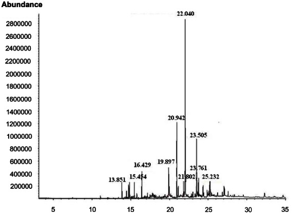 Fig. 5. GC-MS spectral analysis of lipid components of edible gintonin prepared from ginseng root. Acid hydrolyzed gintonin were partitioned between distilled water and n-butanol. The n-butanol layer, after concentration, was further partitioned between distilled water and n-hexane. The n-hexane layer was subjected to gas chromatography-mass spectrometry with a DB5-MS capillary column. Several major peaks were present in hexane fraction of gintonin and were identified. The 20.94 peak was nonanedioic acid that is known to function to defense after infection in plants. The 22.04 peak of palmitic acid (C16:0) and 23.5 peak of linoleic acid (C18:2) were present as dominant fatty acids or their ester forms.