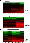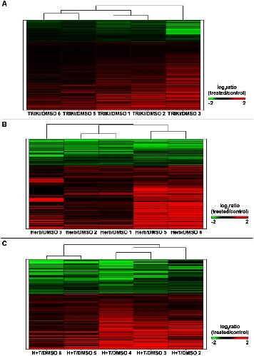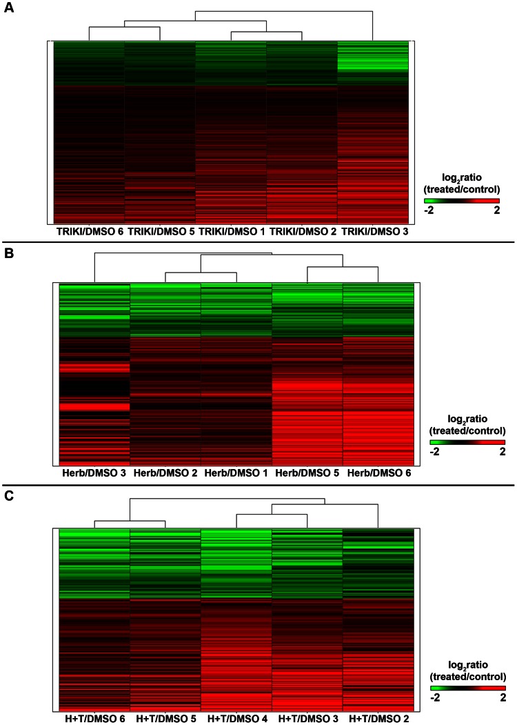 Figure 2. Hierarchical clustering of differentially transcribed genes (q≤0.03) following TRIKI-treatment, Herbimycin A-treatment, and combined inhibitor treatment.Hierarchical clustering of (A) 2330 (TRIKI), (B) 1021 (Herbimycin A), and (C) 411 (combined inhibitors) differentially transcribed genes (q≤0.03) of treated and control female schistosomes. Columns represent three biological replicas as well as two technical replicas (A, TRIKI: columns TRIKI/DMSO 6 and 5, as well as TRIKI/DMSO 1 and 2 represent technical replicas of the first two biological replicas, respectively; TRIKI/DMSO 3 represents the 3rd biological replicate. B, Herbimycin A: columns Herb/DMSO 2 and 1, as well as Herb/DMSO 5 and 6 represent technical replicas of the first two biological replicas, respectively; Herb/DMSO 3 the 3rd biological replicate. C, combined inhibitors: columns H+T/DMSO 6 and 5, as well as H+T/DMSO 4 and 3 represent technical replicas of the first two biological replicas, respectively; H+T/DMSO 2 represents the 3rd biological replicate). Each line shows the calculated log2ratio (treated/control) of the transcription of a gene; genes with a repressed transcription were colored in green (A, TRIKI: 565 genes; B, Herbimycin A: 302 genes; C, combined inhibitors: 157 genes) and genes with an enhanced transcription in red (A, TRIKI: 1765 genes; B, Herbimycin A: 719 genes; C, combined inhibitors: 254 genes).