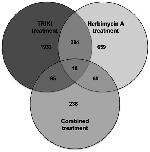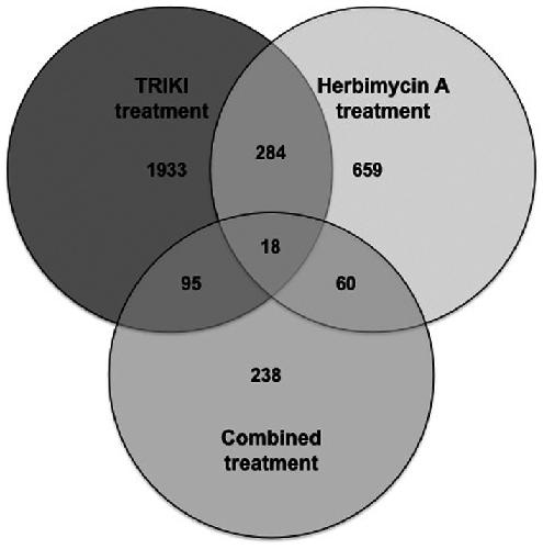 Figure 3. Venn diagram of differentially transcribed genes identified by different inhibitor treatments.Numbers of differentially transcribed protein-coding genes of all three microarray experiments (“TRIKI”, “Herbimycin A”, “Combined treatment”). Each circle represents the microarray result of one of the inhibitor treatments. The intersections show the numbers of corresponding genes differentially transcribed following treatment with different inhibitors.