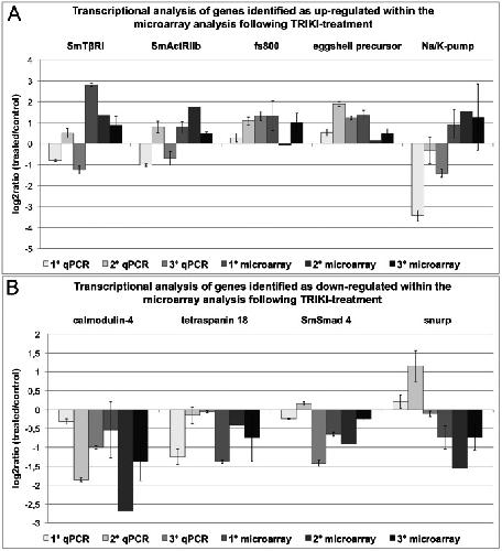 Figure 4. Comparison of qPCR and microarray results following TRIKI-treatment.Transcriptional changes from the TRIKI-treatment of adult schistosome females detected in qPCR and microarray data were calculated as log2ratios (treated/control). The investigated genes were SmTβRI, SmActRIIb, a protein similar to fs800, eggshell precursor, and Na/K-pump as representative for enhanced transcription within the microarray data set (A). The selected genes representing the set of genes with repressed transcription within the microarray data set (B) were calmodulin-4, tetraspanin 18, SmSmad 4, and snurp. For each method three biological replicas were used, each with two technical replicas for the microarray analysis (except microarray 2) and three technical replicas for the qPCR. The mean of the technical replicas was calculated and is presented with standard deviations.
