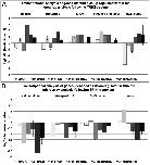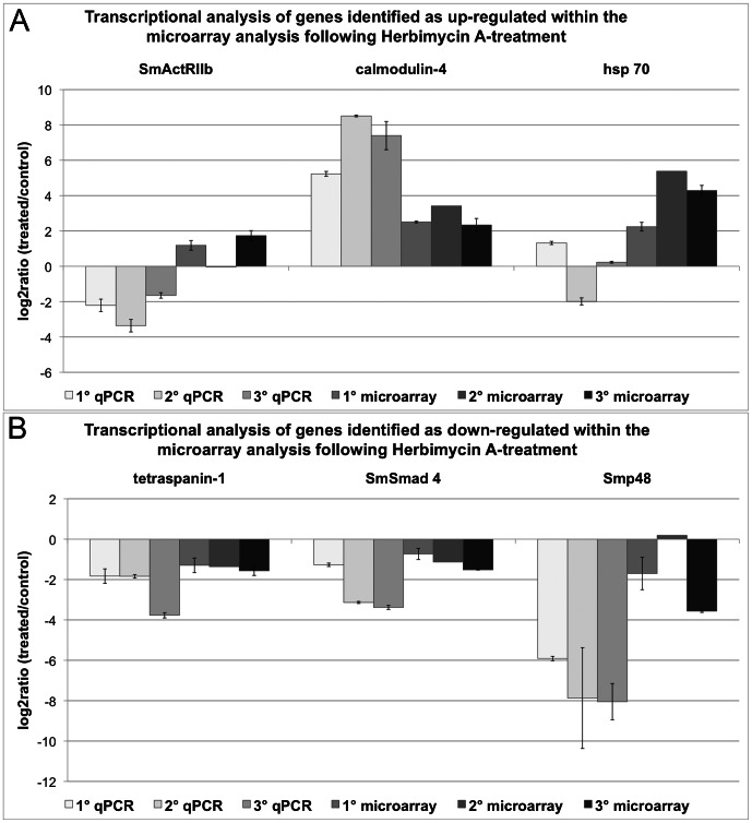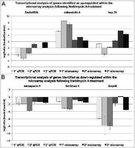 Figure 5. Comparison of qPCR and microarray results following Herbimycin A-treatment.Transcriptional changes from the Herb A-treatment of adult schistosome females detected in qPCR and microarray data were calculated as log2ratios (treated/control). According to the microarray analysis SmActRIIb, calmodulin-4, and hsp70 showed enhanced transcription (A), whereas tetraspanin-1, SmSmad 4, and Smp48 were detected as transcriptionally repressed (B). For each method three biological replicas were used, each with two technical replicas for the microarray analysis (except microarray 2) and three technical replicas for the qPCR. The mean of the technical replicas was calculated and is presented with standard deviations.
