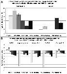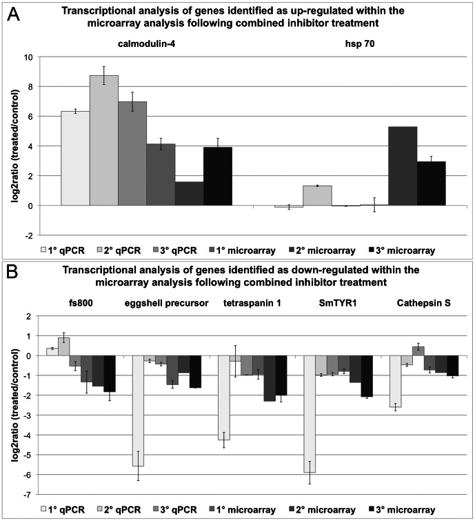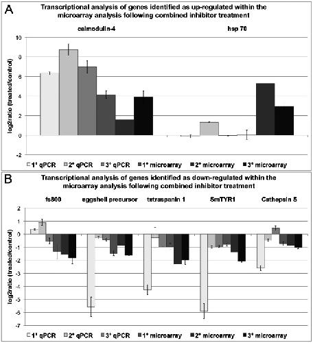 Figure 6. Comparison of qPCR and microarray results following the combined inhibitor treatment.Transcriptional changes from the simultaneous TRIKI- and Herb A-treatment of adult schistosome females detected in qPCR and microarray data were calculated as log2ratios (treated/control). The investigated genes with enhanced transcription, as determined by microarray analysis, were calmodulin-4 and hsp70 (A), the genes with repressed transcription comprised a gene similar to fs800, an eggshell precursor protein, tetraspanin 1, SmTYR1, and cathepsin S (B). For each method three biological replicas were used, each with two technical replicas for the microarray analysis (except microarray 2) and three technical replicas for the qPCR. The mean of the technical replicas was calculated and is presented with standard deviations.