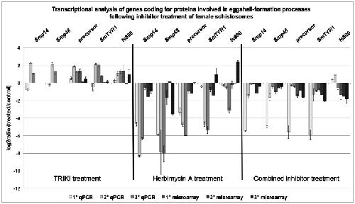 Figure 7. Comparison of qPCR and microarray results of genes involved in eggshell-formation processes.Summary of the log2ratio (treated/control) obtained by qPCR and microarray analyses of genes coding for proteins proven or hypothesised to be involved eggshell-formation processes following treatment of paired female schistosomes with either 300 nM TRIKI, 4.5 µM Herb A, or the combination of both inhibitors. The investigated genes were the eggshell precursor proteins Smp14 and Smp48 as well as a predicted eggshell precursor protein (precursor), the tyrosinase 1 (SmTYR1), and a gene similar to fs800. For each method three biological replicas were used, each with two technical replicas for the microarray analysis (except microarray 2) and three technical replicas for the qPCR. The mean of the technical replicas was calculated and is presented with standard deviations.