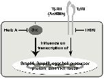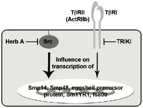 Figure 9. Visual model of the inhibitor effects on transcription of genes involved in eggshell-formation.The inhibition of Src kinases targeted by Herb A and TβRI by TRIKI revealed an influence of both inhibitors on the transcription of genes known to play roles in eggshell formation such as Smp14, Smp48, eggshell precursor protein, SmTYR1 and fs800. Compared to TRIKI treatment, however, a stronger effect on transcription was observed when adult schistosome couples were treated with Herb A. From this we conclude cooperative signal- transduction activities during eggshell-formation with a more dominant role of Src kinases in promoting the expression of involved genes.