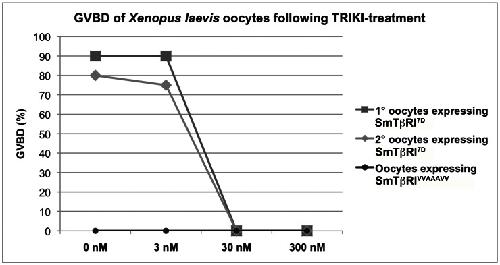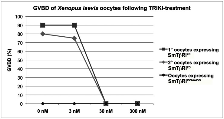 Figure 1. Inhibition of SmTβRI activity by TRIKI.Inhibitory effect of TRIKI on SmTβRI kinase activity was monitored in Xenopus laevis oocytes expressing the intracellular domain of SmTβRI by measuring the level of GVBD induced by the kinase in the oocytes. Results of GVBD assays performed in TRIKI-treated oocytes (used concentrations: 0 nM, 3 nM, 30 nM, 300 nM), which expressed either the constitutively active intracellular part of SmTβRI (SmTβRI7D; the experiments were performed twice: 1°, dark grey squares; 2°, light grey rhombs), or an inactive kinase variant (SmTβRIVVAAAVV, black circles) as control.