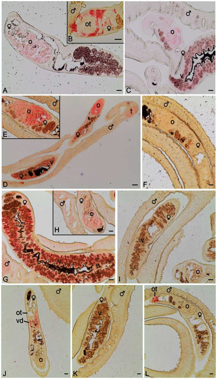 Figure 8. In situ hybridization localizing the schistosome homologs of hippocalcin, ORAI-1, a predicted egg-shell precursor protein gene, and calmodulin-4.Sections (5 µm) of adult schistosome couples (males and females are indicated), were hybridized with DIG-labeled antisense-RNA probes of hippocalcin (A, B), ORAI-1 (D, E), eggshell precursor protein gene (G, H), and calmodulin-4 (J, K). For control, DIG-labeled sense-RNAs probes of hippocalcin (C), ORAI-1 (F), eggshell precursor protein gene (I), and calmodulin-4 (L) were used. Signals were observed in the ovary (o), the vitellarium (v), around the ootype (ot) where Mehli's gland is located, and the testes (t). Scale bar: 20 µm.