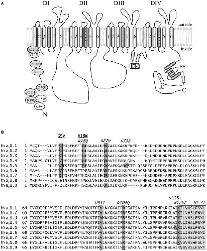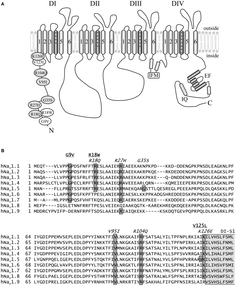 Figure 1. Schematic representation of hNav1.5 and the N-terminal mutations investigated in this study. (A) Proposed hNav1.5 topology. Affected residues are indicated in white (LQT3) and light grey (BrS). The schematic structure also highlights some important structural features (DI to DIV—domain I to IV, IFM—residues isoleucine, phenylalanine, and methionine of the inactivation gate, IQ—calmodulin binding motif, EF—Ca++ binding EF hand domain). (B) Alignment of the N-terminal sequences of human Nav1.1—Nav1.9. Mutations associated with LQT3 or BrS are underlined or indicated in italics, respectively. Most of the eight affected residues are conserved among the Nav1 subfamily. Residues at position 35 are variable, and position 125 is occupied by isoleucine in all other human Na+ channels. All eight residues affected by a SCN5A mutation are identical in Nav1.5 of human, rat, mouse, and dog (not shown). The N-terminal region of the first putative membrane spanning segment DI-S1 is indicated in light grey. References: G9V (Millat et al., 2006), R18W (Tester et al., 2005), R18Q (Kapplinger et al., 2010), R27H (Priori et al., 2002), G35S (Levy-Nissenbaum et al., 2001), V95I (Liang et al., 2006), R104Q (Levy-Nissenbaum et al., 2001), V125L (Tester et al., 2005), K126E (Vatta et al., 2002a).