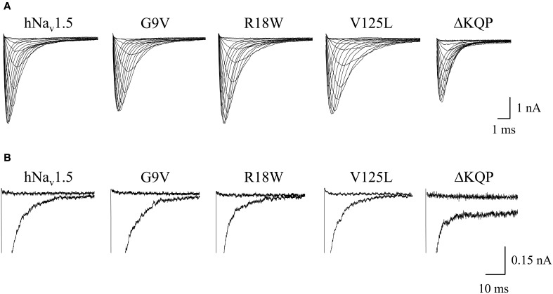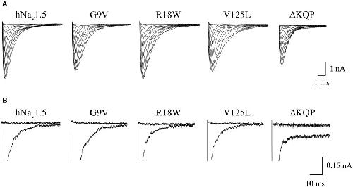 Figure 2. Whole-cell Na+ currents upon expression in HEK293 of hNav1.5 mutant channels associated with LQT3. (A) Current families. Currents were elicited by test potentials from −80 mV to various test pulses in 5 or 10 mV increments at a pulsing frequency of 1.0 Hz. (B) Persistent currents at −20 mV. The non-inactivating current fraction was similarly small in both wild-type and mutant hNav1.5 channels. For individual values see Table 1. Mutant ΔKQP channels were used as a positive control.