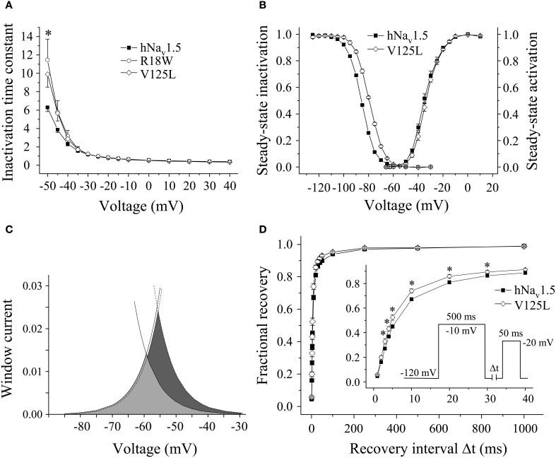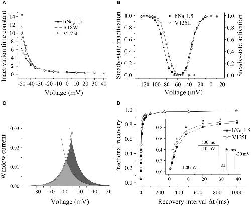 Figure 3. Electrophysiological properties in HEK293 cells of mutant hNav1.5 channels associated with LQT3. (A) Inactivation time constants τh (ms) as function of voltage. At −50 mV both R18W and V125L channels inactivated more slowly compared to hNav1.5 (*indicates p < 0.05). G9V channel inactivation was indistinguishable from hNav1.5 (data not shown). (B) Steady-state activation and inactivation in V125L channels. The figure shows the mean of 4 representative measurements for each. (C) Window current in hNav1.5 (grey area, solid lines) and V125L (dark grey area, dotted lines). (D) Recovery from inactivation was accelerated in V125L (* indicates p < 0.05 vs. hNav1.5). For individual values see Table 2.