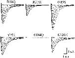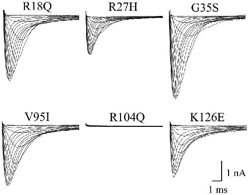 Figure 4. Whole-cell Na+ currents upon expression in HEK293 of hNav1.5 mutant channels associated with BrS. Currents were elicited from −80 mV to various test pulses in 5 or 10 mV increments at a pulsing frequency of 1.0 Hz (holding potential −120 mV). For average peak current densities see Table 1. Expression of R104Q did not result in functional channels in the mammalian expression system.