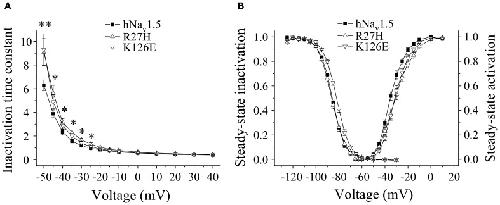 Figure 5. Electrophysiological properties in HEK293 cells of mutant hNav1.5 channels associated with BrS. (A) Inactivation time constants τh (ms) as function of voltage. K126E channels inactivated more slowly at −50 mV (**), R27H inactivated more slowly from −50 to −25 mV (*), when compared to hNav1.5. R18Q, G35S, and V95I channels were indistinguishable from hNav1.5 (data not shown). (B) Steady-state activation and steady-state inactivation curves. Mid-activation potentials (Vm) were significantly shifted towards depolarized potentials in both R27H and K126E. Mid-inactivation potential Vh was shifted only in K126E. The figure was drawn using the mean of 4 representative measurements for each. Vm and Vh of the other mutant channels, R18Q, G35S and V95I, were indistinguishable from the respective hNav1.5 values. For data and statistics see Table 2.