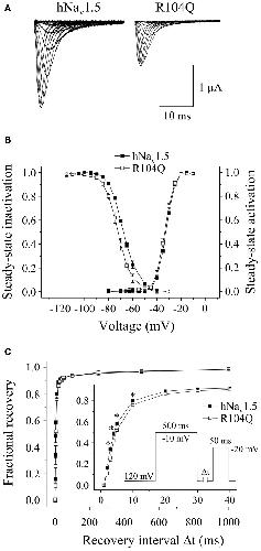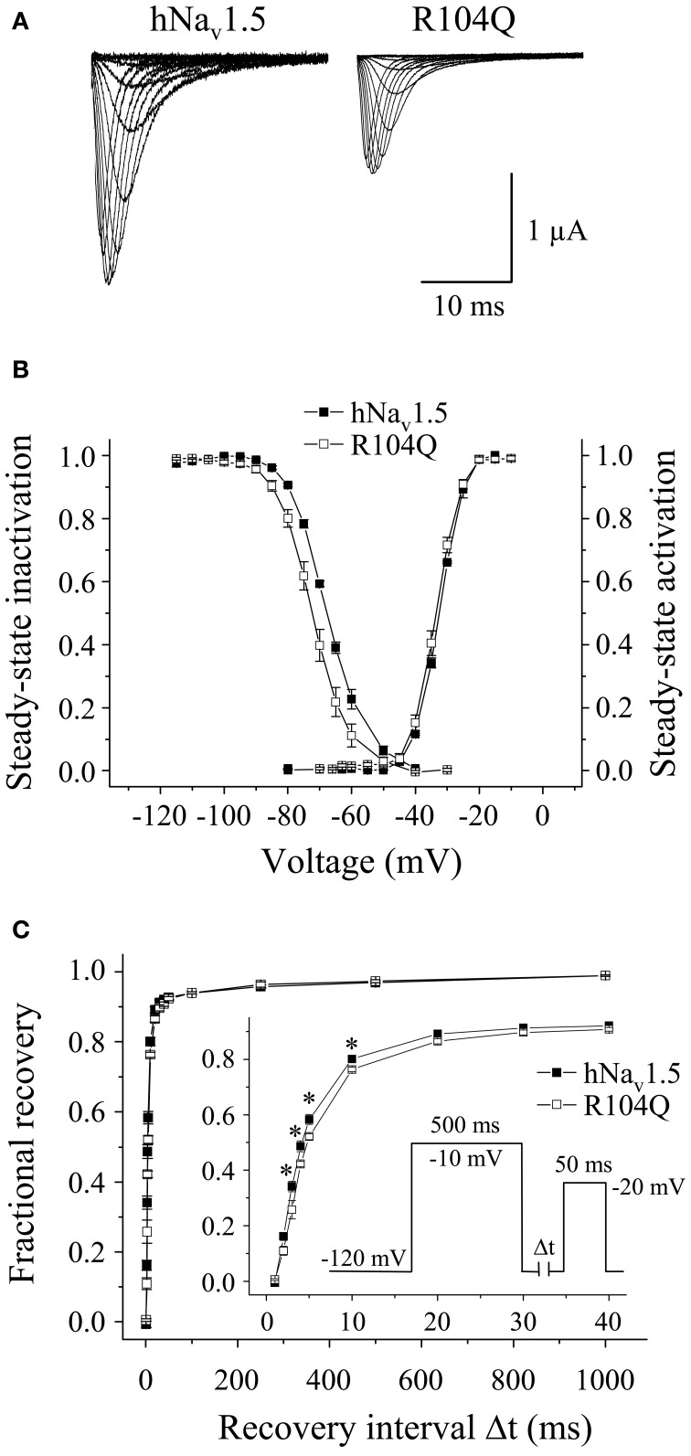Figure 6. Electrophysiological properties of R104Q in Xenopus oocytes. (A) Whole-cell Na+ currents. Peak current amplitudes were significantly reduced in R104Q (see Table 1). Currents were elicited from −80 mV to various test pulses in 5 or 10 mV increments at a pulsing frequency of 1.0 Hz (holding potential −120 mV). (B) Steady-state activation and inactivation curves. In R104Q, steady-state availability was significantly reduced. (C) Recovery from inactivation was slower in R104Q (* indicates p < 0.05 vs. hNav1.5). For individual values see Table 3.