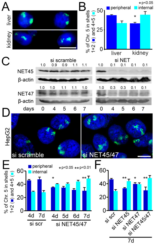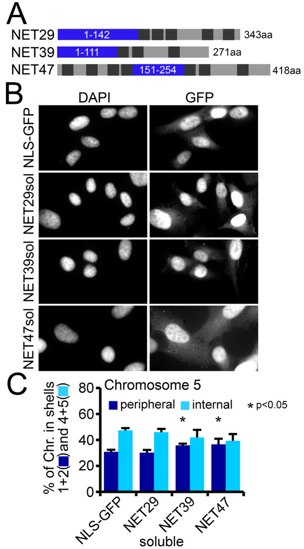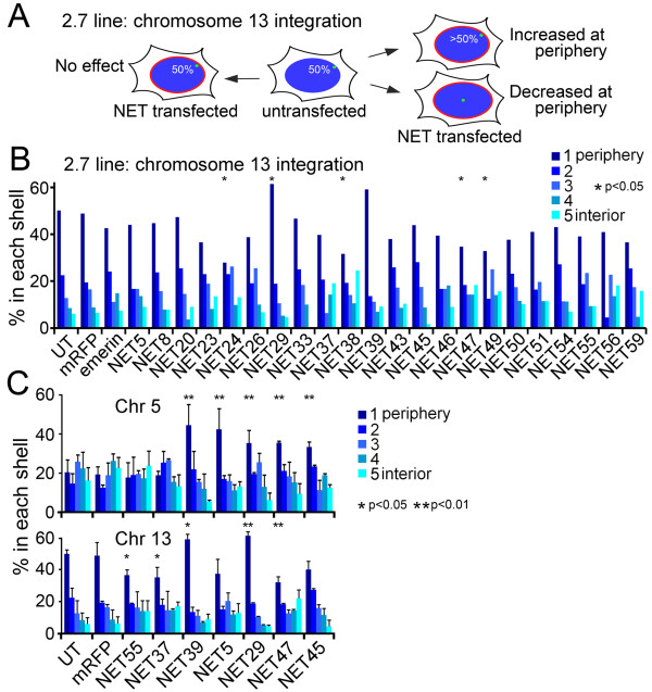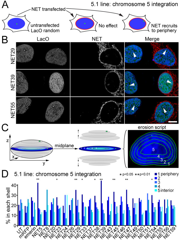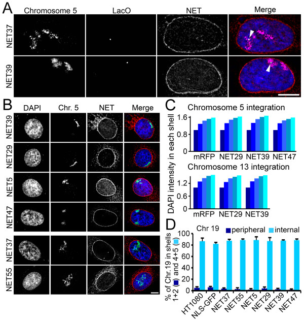 BACKGROUND: Different cell types have distinctive patterns of chromosome positioning in the nucleus. Although ectopic affinity-tethering of specific loci can be used to relocate chromosomes to the nuclear periphery, endogenous nuclear envelope proteins that control such a mechanism in mammalian cells have yet to be widely identified. RESULTS: To search for such proteins, 23 nuclear envelope transmembrane proteins were screened for their ability to promote peripheral localization of human chromosomes in HT1080 fibroblasts. Five of these proteins had strong effects on chromosome 5, but individual proteins affected different subsets of chromosomes. The repositioning effects were reversible and the proteins with effects all exhibited highly tissue-restricted patterns of expression. Depletion of two nuclear envelope transmembrane proteins that were preferentially expressed in liver each reduced the normal peripheral positioning of chromosome 5 in liver cells. CONCLUSIONS: The discovery of nuclear envelope transmembrane proteins that can modulate chromosome position and have restricted patterns of expression may enable dissection of the functional relevance of tissue-specific patterns of radial chromosome positioning.