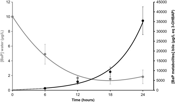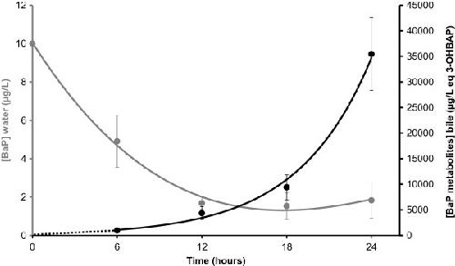 Kinetics of benzo[a]pyrene (BaP) concentrations in water (grey curve) and metabolite concentrations in bile (black curve) as a function of exposure time during