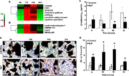 Lipid metabolism disorder induced by BaP. A. Hierarchical clustering of cholesterol biosynthesis genes differentially transcribed compared to control. The color scale indicates transcription ratios relative to the control. Gene names or annotations are indicated. 7-DHCR, 7-dehydrocholesterol reductase; FDF1, farnesyl-diphosphate farnesyltransferase 1; 24-DHCR, 24-dehydrocholesterol reductase; CYP51A1, cytochrome P450-51A1. Stars indicate significant transcription variations (>1.5-fold in either direction and adjusted p < 0.05). B. Hierarchical clustering of genes involved in cholesterol biosynthesis regulation and depletion from the blood differentially transcribed compared to control. The color scale indicates transcription ratios relative to the control. Gene names or annotations are indicated. SREBP-TF2, sterol regulatory element binding transcription factor 2; LDLR, low density lipoprotein receptor, HMGCoAR, 3-hydroxy-3-methylglutaryl-CoA reductase. Stars indicate significant transcription variations (>1.5-fold in either direction and adjusted pâ<â0.05). C. Kinetics of cholesterol concentration in bile. Data represent meanâ±âSE values for 3 replicates. Statistical analysis was performed using the MannâWhitney test, asterisks indicate a significant difference from the control: *, pâ<â0.05. D. Oil red staining for total lipid content measures in the livers of control and BaP-exposed animals. Lipid content was indicated by red staining. Barsâ=â25 μm. E. Percentage of oil red area in the livers of control and BaP-exposed animals. Data are meanâ±âSE values for 24 sections replicates. Statistical analysis was performed using the MannâWhitney test (nâ=â3), and asterisks indicate a significant difference from the control: *, pâ<â0.05.