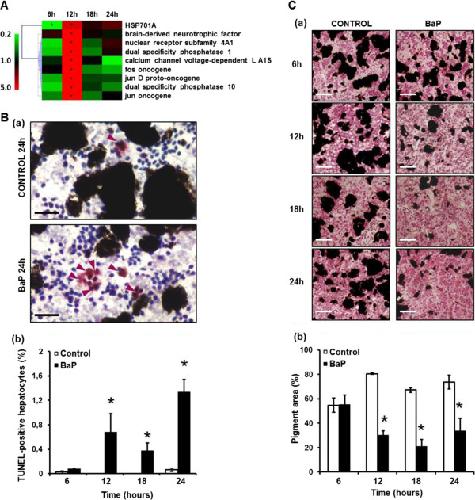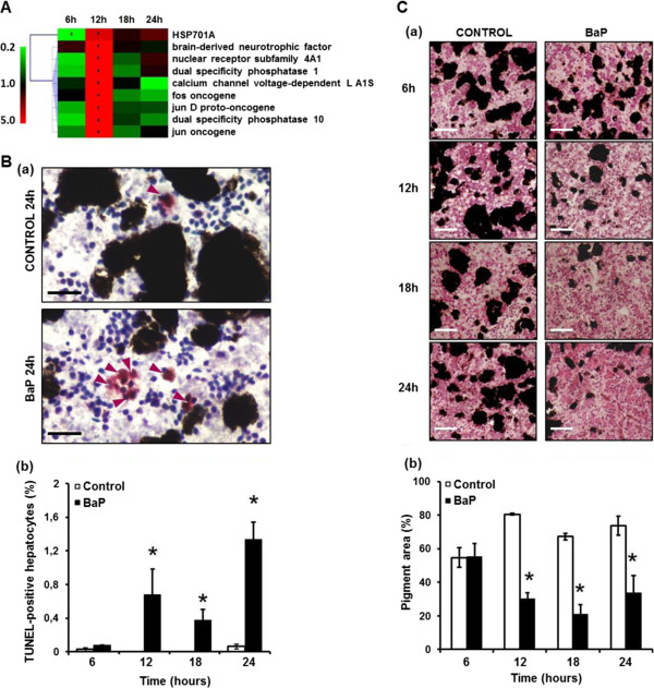 Hepatotoxicity induced by BaP. A. Hierarchical clustering of MAPK genes found differentially transcribed compared to the control. Color scale indicates transcription ratios relative to the control. Gene names or annotations are indicated. HSP701A, heat shock protein 701A. Stars indicate significant transcription variations (>1.5-fold in either direction and adjusted p < 0.05). B. (a) TUNEL staining detecting apoptosis-induced DNA damage in hepatocytes in control and in BaP-exposed animals at 24 hours. Arrows indicate apoptotic hepatocytes. Bars = 50 μm. (b) Percentage of TUNEL-positive nuclei in the livers of control and BaP-exposed animals according to the exposure time points. Data are mean ± SE values for 21 sections replicates. Statistical analysis was performed using the Mann–Whitney test, and asterisks indicate a significant difference from the control: *, p < 0.05. C. (a) Hematoxylin-eosine-safran (HES) staining of liver sections from control and X. tropicalis exposed to BaP. Bars = 100 μm. (b) Percentage of pigment area in liver sections of control and BaP exposed animals. Data are mean ± SE values for 21 sections replicates. Statistical analysis was performed using the Mann–Whitney test (n = 3), and asterisks indicate a significant difference from the control: *, p < 0.05.