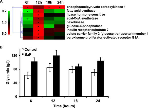 Carbohydrate metabolism disturbances induced by BaP. A. Hierarchical clustering of genes found to be differentially transcribed compared to the control and involved in insulin, adipocytokine and gluconeogenesis pathways. Color scale indicates transcription ratios relative to the control. Gene names or annotations are indicated. Stars indicate significant transcription variations (>1.5-fold in either direction and adjusted p < 0.05). B. Glycemia kinetics in control and in BaP-exposed X. tropicalis. Data are expressed as mean ± SE of 3 replicates.