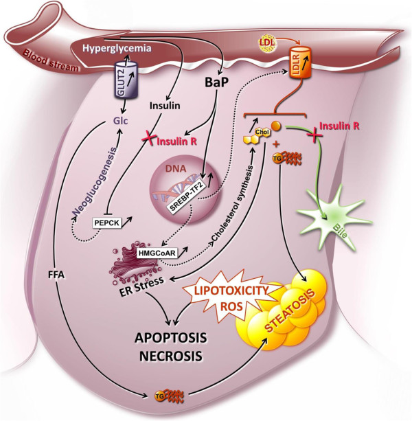 hepatocyte responses to BaP exposure at sub-lethal concentration. This model, based on our transcriptome and liver phenotype dynamic analyses, suggests that BaP is responsible for the induction of an insulin-resistance-like phenotype in Xenopus. Insulin resistance is characterized by the over-transcription of gluconeogenic enzymes genes (PEPCK), sustained hyperglycemia, an over-transcription of glucose transporter (GLUT2) and severe liver steatosis. Consequently, hyperinsulinemia may lead to the marked induction of cholesterol synthesis pathways and to a decrease in cholesterol export to the bile. The accumulation of lipids and cholesterol in the hepatocytes thus induces both ER stress and lipid toxicity leading to apoptosis or necrosis. LDL, Low density lipoprotein; LDLR, Low density lipoprotein receptor; GLUT2, Glucose transporter 2; Glc, glucose; Chol, cholesterol; PEPCK, phosphoenolpyruvate carboxykinase 1; HMGCoAR, 3-hydroxy-3-methylglutaryl-CoA reductase; SREBP-TF2, sterol regulatory element binding transcription factor 2; ER, endoplasmic reticulum; FFA, Free fatty acid, TG, triglycerides; Insulin R, insulin resistance.