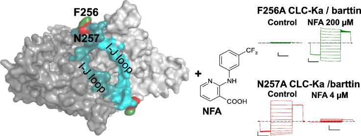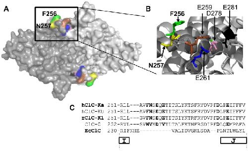 Fig. 1. Localization of F256 and N257 and of the Ca2 + binding site on the homology model of CLC-Ka. (A) Surface representation of the CLC-Ka model [27]. The two subunits viewed from the extracellular side are indicated by two tones of gray. The residues involved in the response to NFA (F256 and N257) and those that coordinate Ca2 + (E259, E261, D278, E281) [14,27] are colored differently: green F256, yellow N257, red E259, blue E261, pink D278, and black E281. (B) Zoom of the region containing the residues of interest. Residues are depicted as sticks and colored as in A. (C) Sequence alignment around the I–J loop of CLC-Ka, -Kb, -K1, CLC-0, and EcCLC.