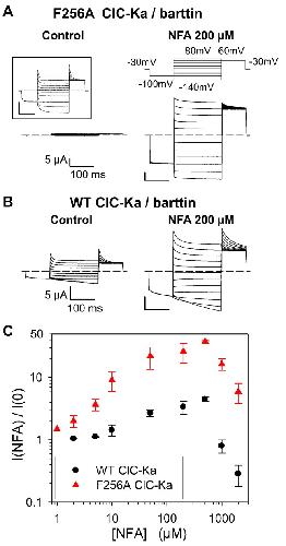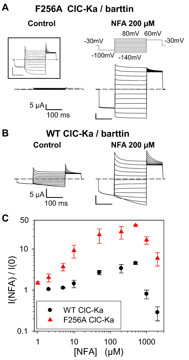 Fig. 2. F256A CLC-Ka is hugely activated by NFA. (A–C) Effect of NFA on F256A and WT CLC-Ka in Xenopus oocytes. Typical currents of F256A (A) and WT CLC-Ka (B) in response to the IV-protocol (top) in control (left) and at 200 μM NFA (right). The inset (A) shows F256A currents at high magnification (C) Dose–response relationship of NFA modulation of WT and F256A CLC-Ka. The currents acquired at 60 mV are normalized to values measured in standard solution (i.e. 0 NFA) and plotted versus [NFA]ext (used concentrations: 1, 2, 5, 10, 50, 200, 500, 1000 and 2000 μM) (n ≥ 3).